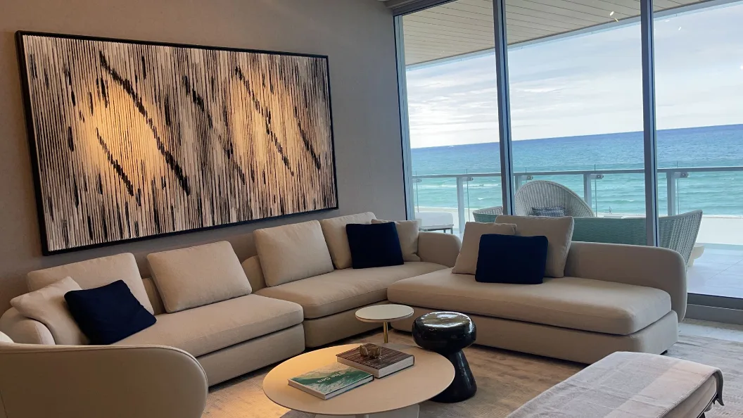 This creates a living dialogue between the art and the architecture. A physical experience that evolves every time you walk past it. We are not selecting a painting. We are creating a site-specific installation that feels as though it was born within the room.